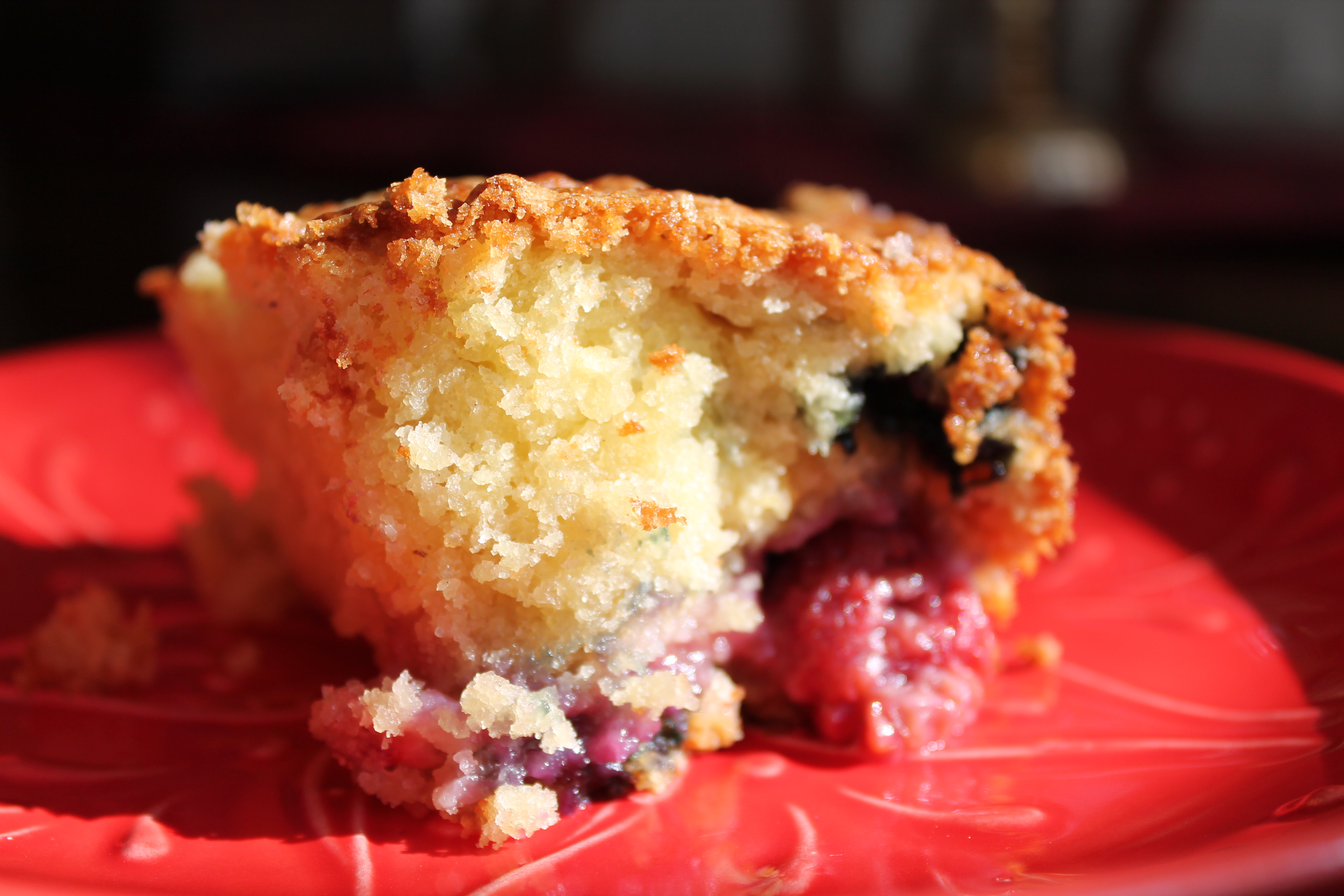 Preheat oven to 375 °F. Grease a 9” square baking dish. In a large bowl, sift the flour, baking powder, baking soda and salt. Combine the strawberries, blueberries & raspberries. Sprinkle fruit with one cup of sugar and toss gently. In another bowl whisk the milk, eggs & melted butter. Pour the milk mixture into the flour mixture and mix gently (don’t over-mix); mixture will not be smooth. Gently fold in the sugared berries. Pour into an 8” square baking pan. Sprinkle with the additional one tablespoon sugar. Bake 45-50 minutes or until knife inserted into center comes out clean. Enjoy with a cup of coffee or tea or milk!