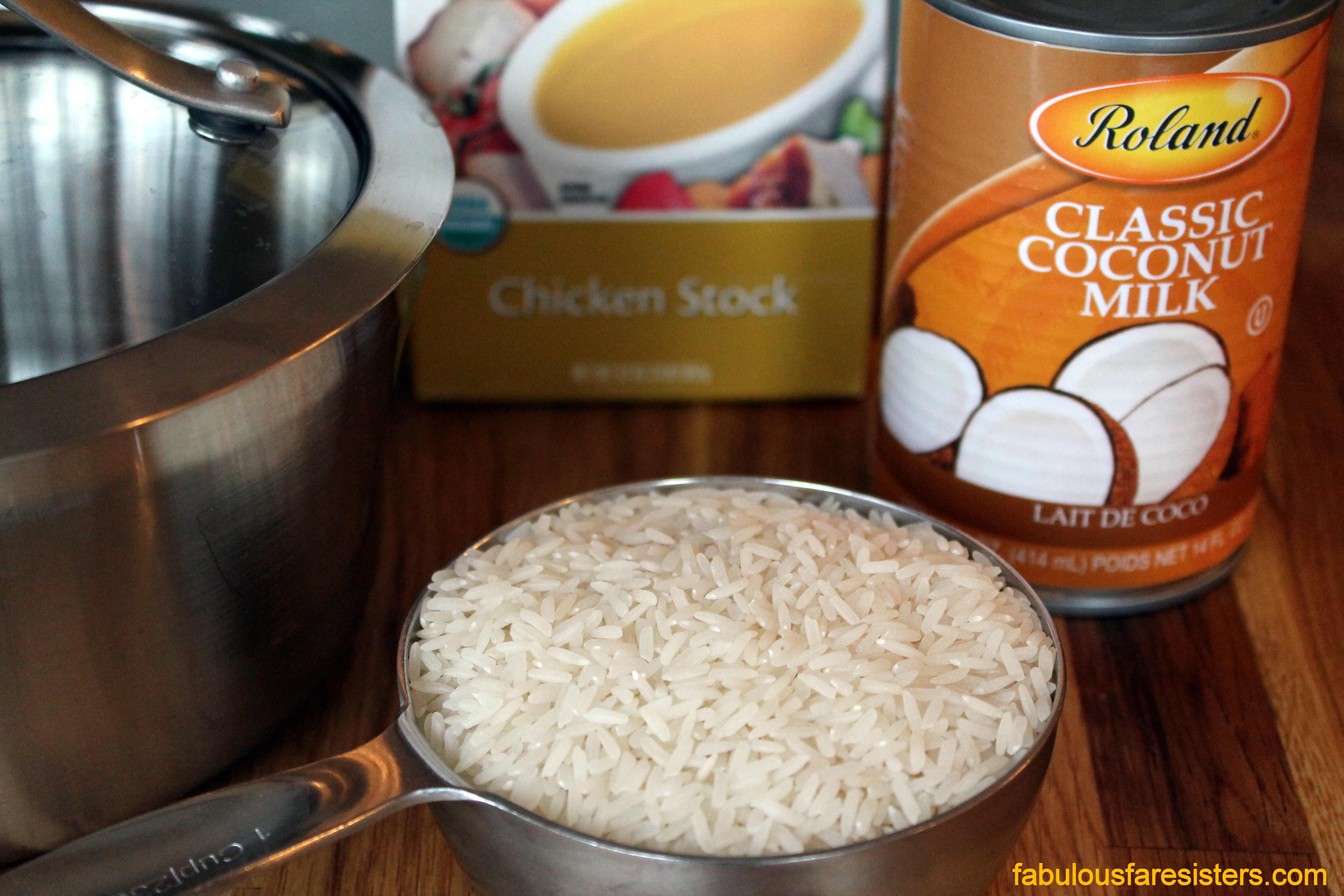 In a medium sauce pan, combine the rice and the vegetable stock. Pour in coconut milk and add sugar and salt. Bring to a boil. Reduce heat to simmer and allow to cook 10-15 minutes until rice is tender.
