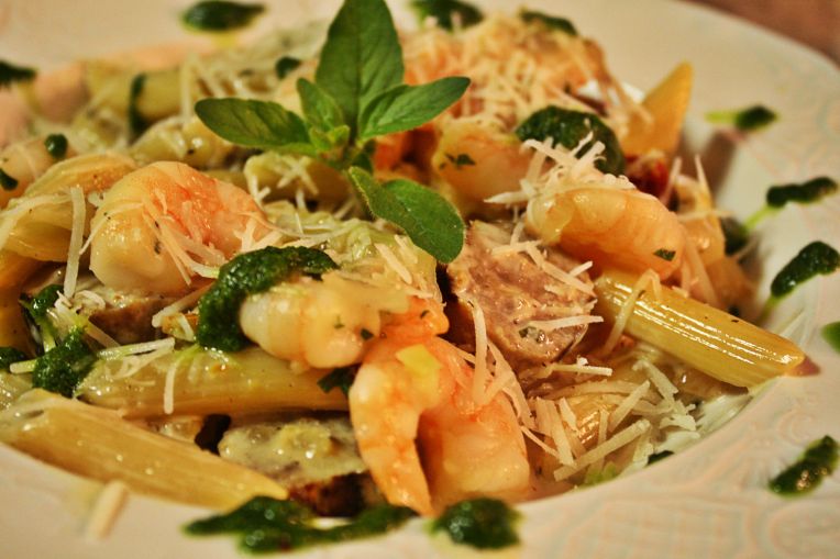 Cook pasta to desired tenderness. Take a sharp knife and cut casing off sausages. Cook in a skillet until sausage is cooked through, about 5 minutes on each side. Remove to a cutting board and slice or cut to desired bite sizes. In the same pan add shrimp and cook on medium low until the shrimp just begins to become opaque. Remove shrimp from pan and set aside. Next cook onions, garlic, and sun-dried tomatoes until tender. Add white wine and cook for several minutes, (about three). Return cut sausage to pan, add cream and heat for 5 minutes. Remove from heat and add shrimp. Serve over pasta, drizzle on pesto and shredded Pecorino cheese. Easy and delicious!