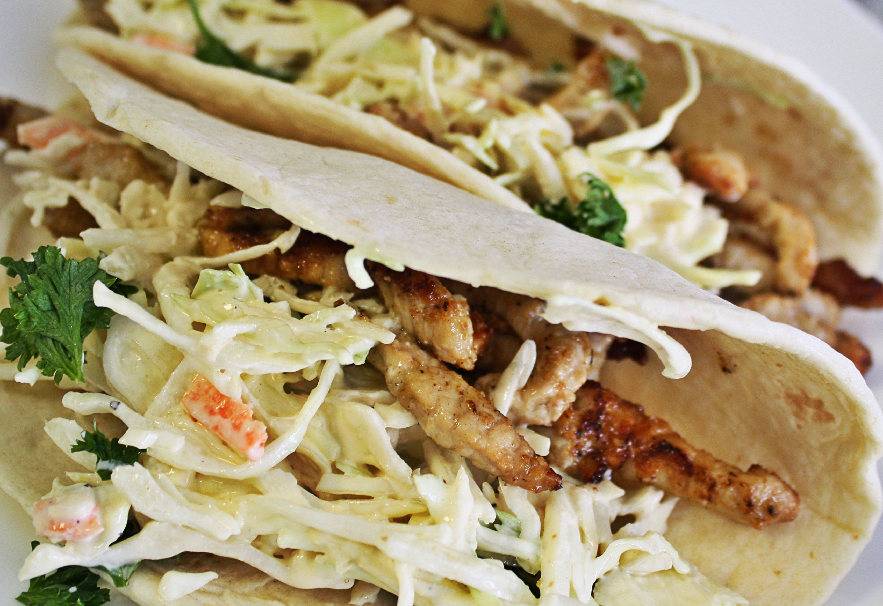 Mix the marinade with the sliced pork, cover and place in the refrigerator for 15 minutes. In a separate bowl mix cabbage and Caesar dressing and set aside. Heat skillet and saute pork in marinade until golden brown, (about 5 minutes). Heat tortillas, add 1/4th of the meat to each tortilla, top with slaw, chopped parsley and some shredded Pecorino cheese. Light, delicious and filling.