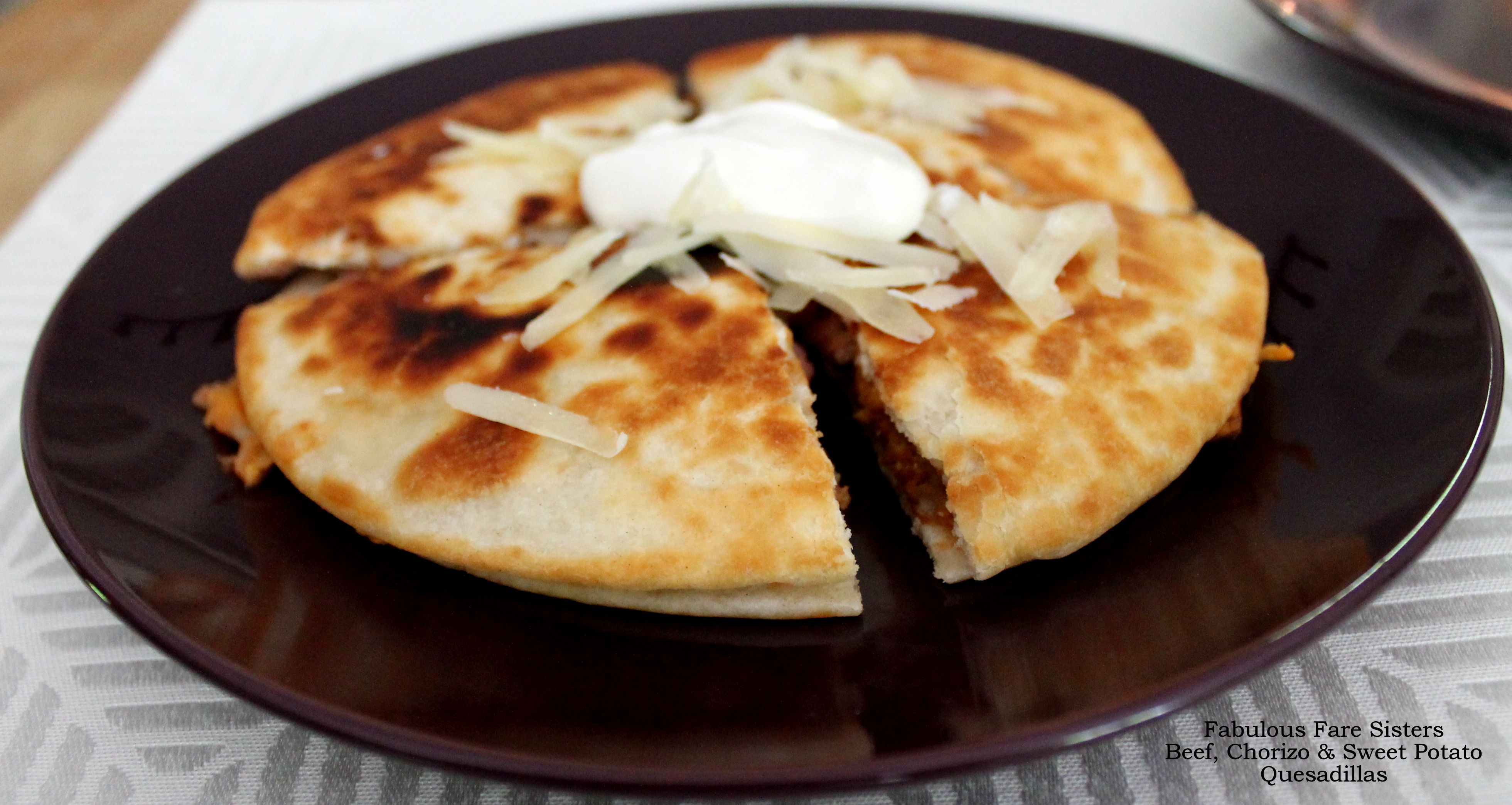 This is one of those wonderful lunches that came together from leftovers…Man, I love it when that happens! These crispy tortillas are filled with hearty beef, tasty chorizo, sweet potato, refried pinto beans and cheddar cheese. Served nice and warm!