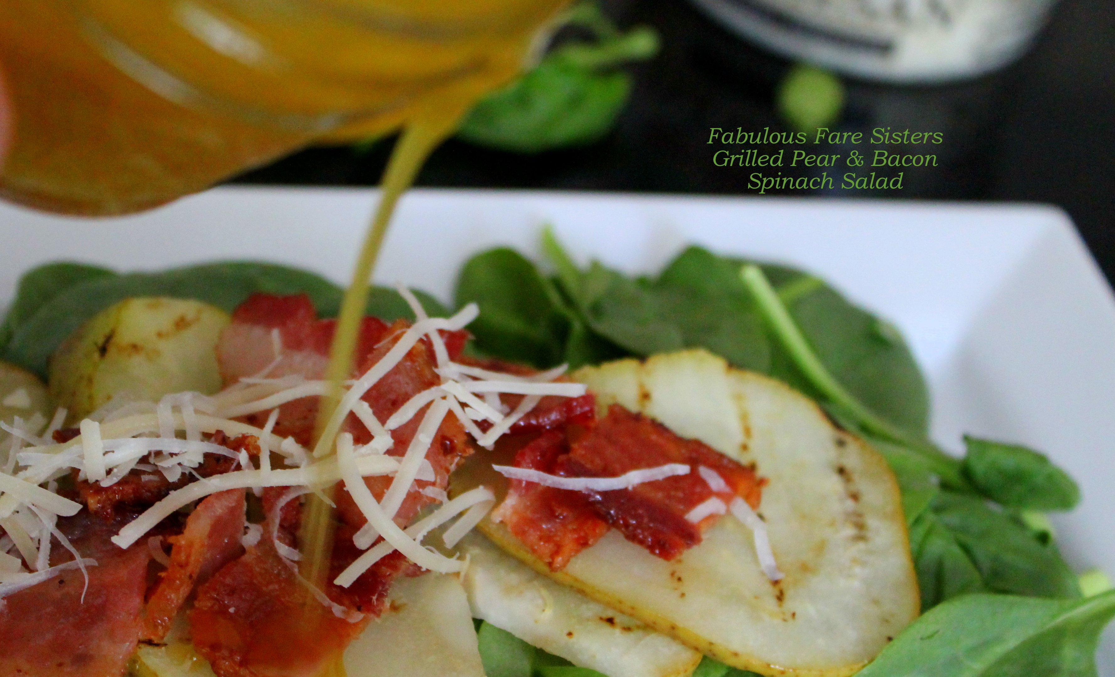 Growing up, my Mom made a spinach salad with bacon that was always a welcome addition to the table. I actually don’t have her recipe (shame on me!) but from what I can remember it was simply spinach lettuce, crisp bacon & thinly sliced red onion with a tangy vinaigrette. To change it up a bit I decided I wanted to add a twist with the addition of grilled sliced pears and a Maple-Bacon Vinaigrette. Mom – take a look and tell me what you think!