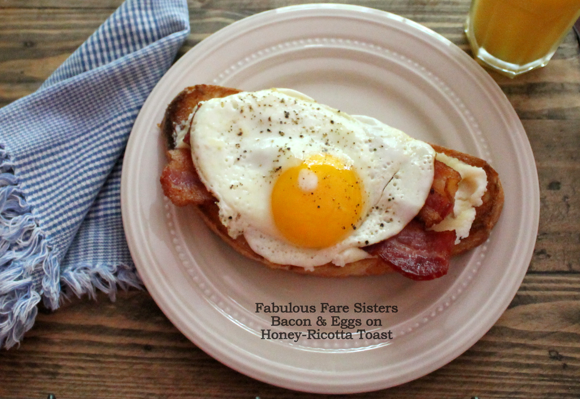 Toast the bread. Cook the bacon until crisp. Fry the eggs as you desire. Smear some ricotta on each toast. Drizzle with as much honey as you desire.Top with two slices of crisp bacon and an egg.