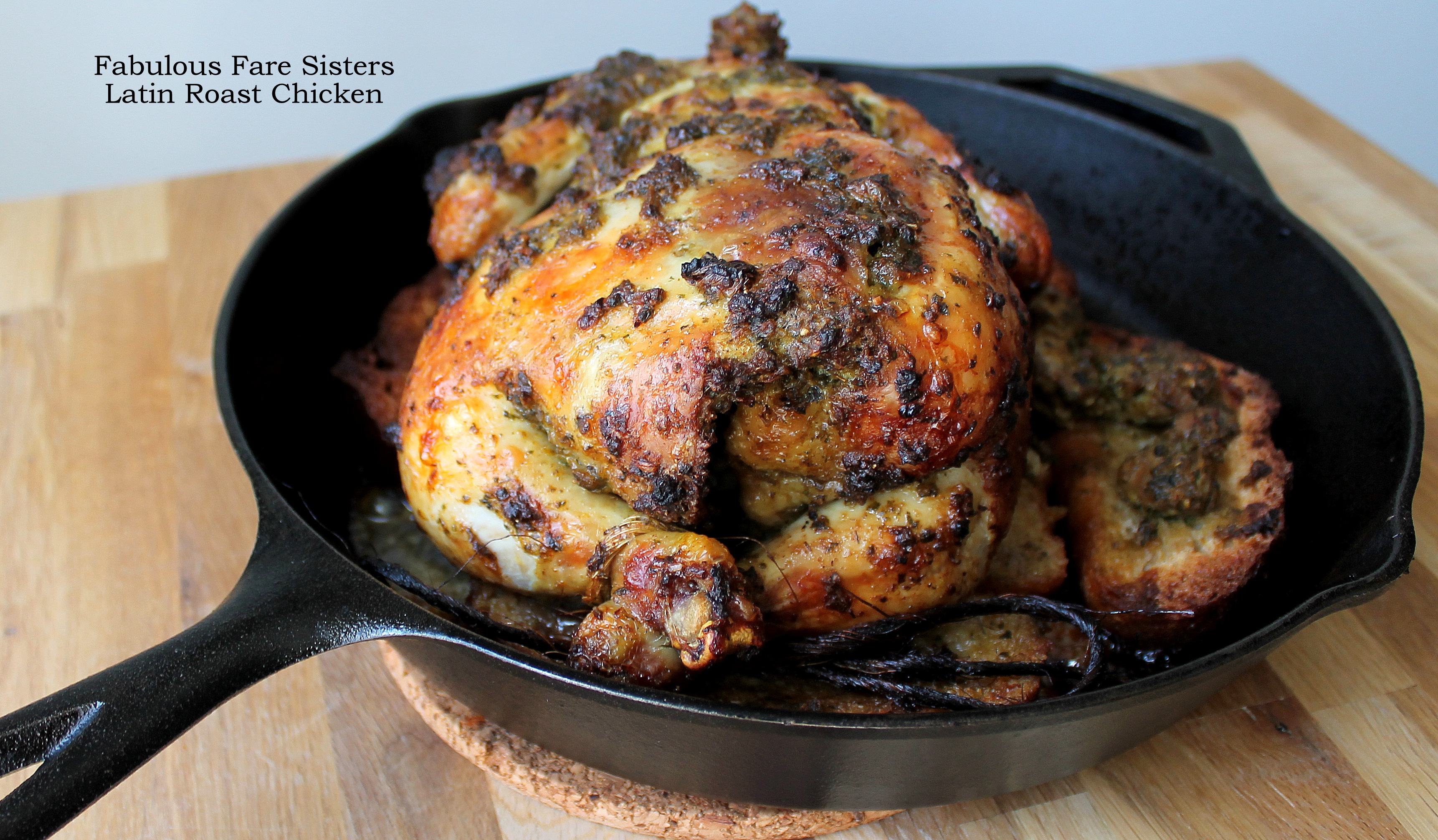 I brought home one of those whole chickens from the supermarket and wasn’t quite sure what I was going to do with. We love roasted chicken but sometimes the flavor is just blah…so I mixed up some great spices to marinate it and arranged it on some Rustic French Bread slices in a cast iron skillet…into the oven it went…and out came a mouth-watering flavorful Latin Roast Chicken…it can’t get any better than that!
