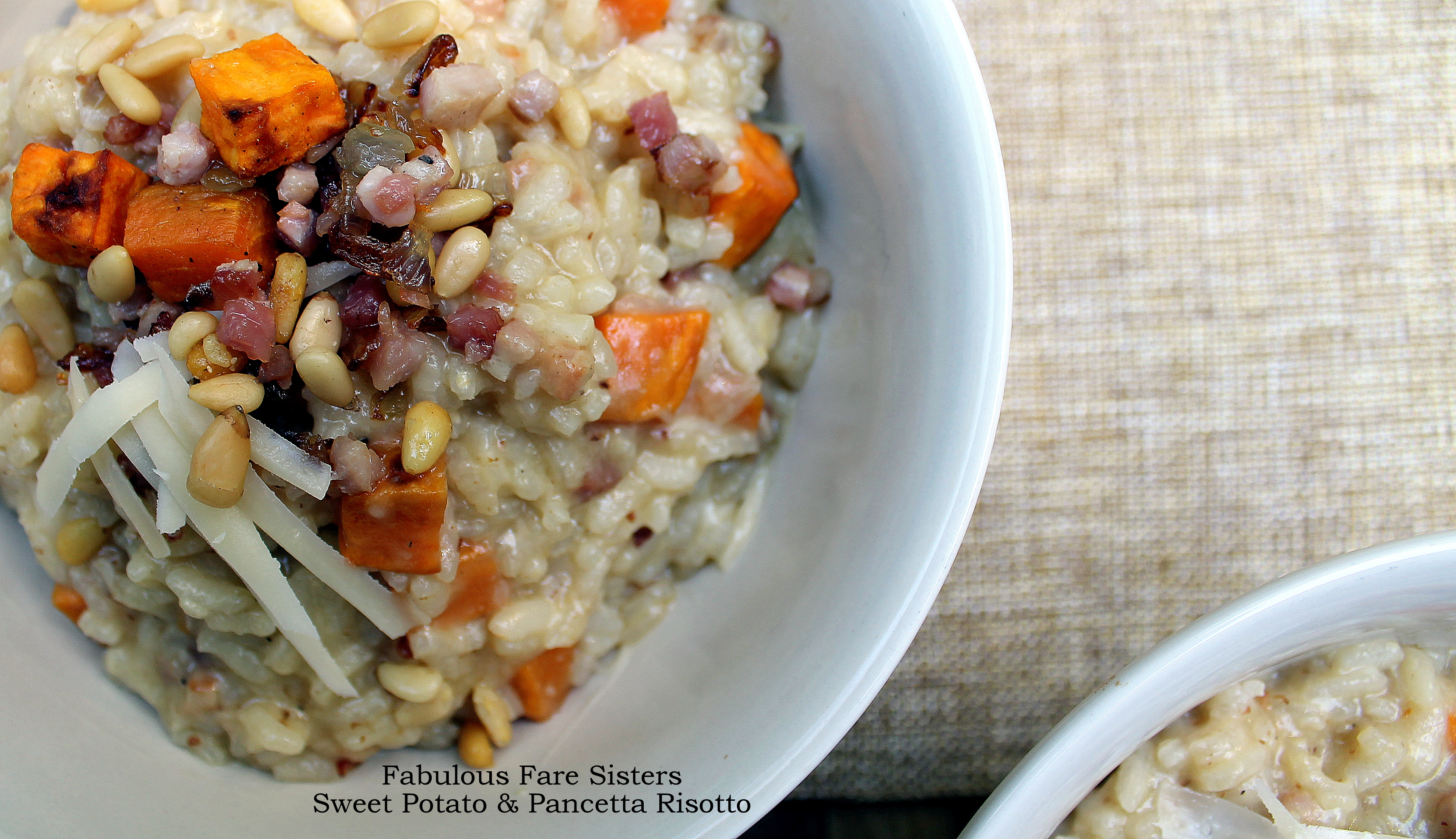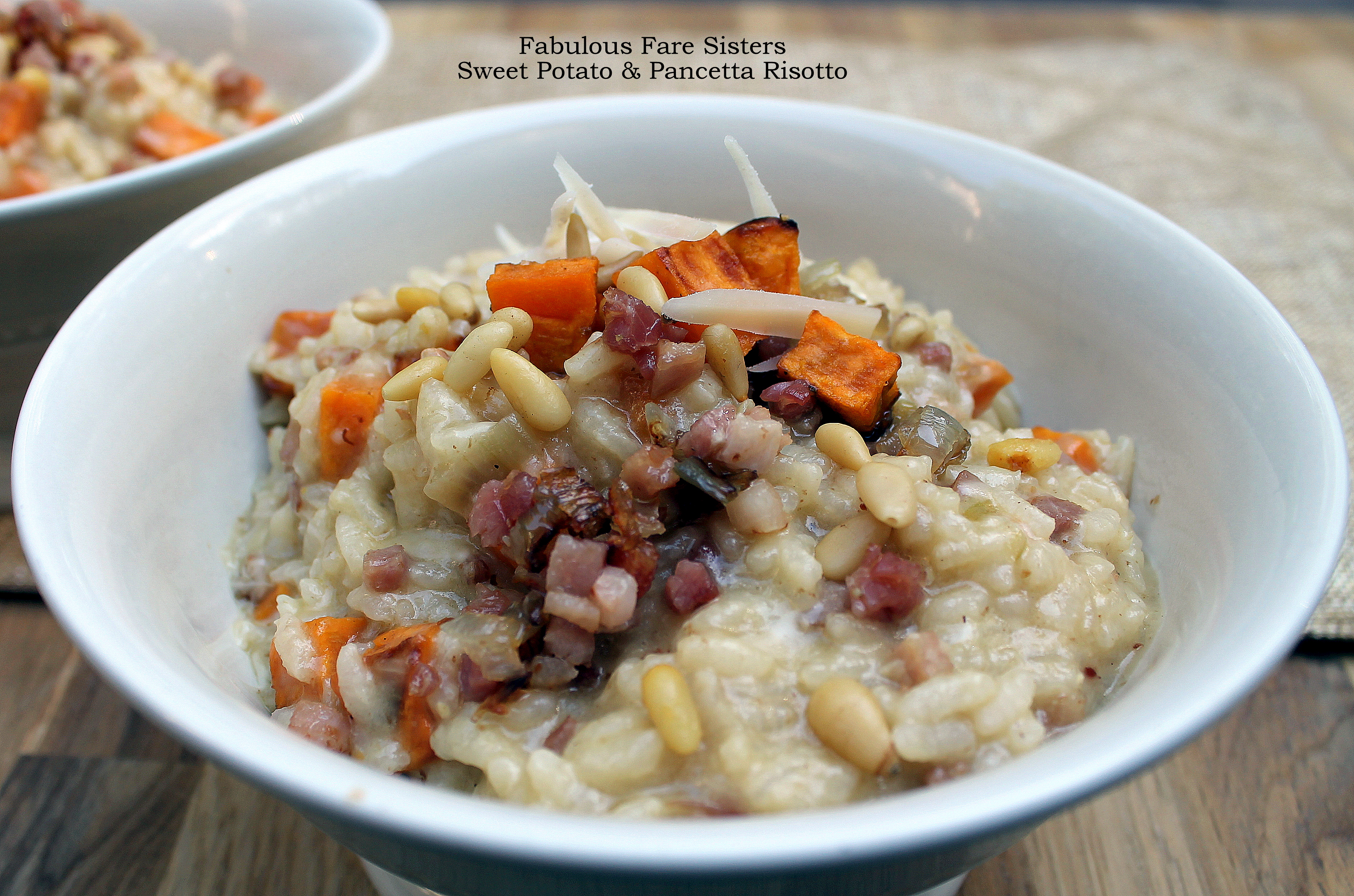 Heat oven to 450°F. Peel sweet potatoes, cut into small cubes and toss in a bowl with one tablespoon extra virgin olive oil. Season with 1/2 teaspoon salt and some fresh ground pepper. Place in a single layer on a baking sheet that has been lined with parchment paper. Roast in the heated oven for 20 minutes. Meanwhile, in a deep skillet, heat another tablespoon of extra virgin olive oil on medium-high heat. Add the shallots and sauté for 3 minutes. Add the pancetta and sauté 5 minutes. Remove two heaping tablespoons of cooked pancetta & shallots mixture and reserve. Stir in the arborio rice and the butter; sauté 3 minutes. Add chicken broth, one ladle at a time (about 1/4 cup each time), stirring between each addition of chicken broth – allowing the broth to absorb slowly into the rice; this can take up to 30 minutes. When all the broth has been absorbed and the risotto is tender and creamy, stir in the Parmesan cheese and three quarters of the roasted sweet potatoes. Scoop into bowls and top each risotto serving with the reserved sweet potatoes, pancetta and additional Parmesan cheese.