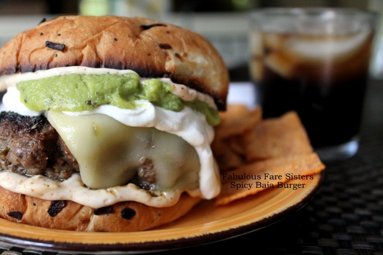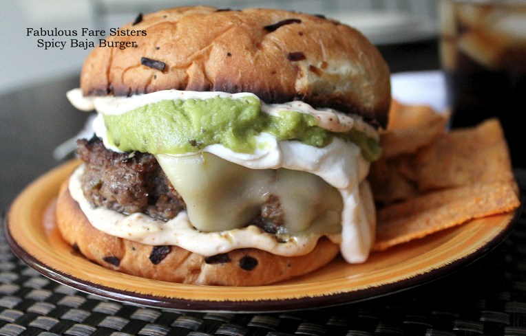 It’s Burger Time! On today’s menu is a Spicy Baja Burger…a spicy-seasoned burger topped with Pepper Jack cheese, guacamole and sour cream served on a toasted onion roll that’s been slathered with spicy chipotle mayonnaise…delectable and delicious!