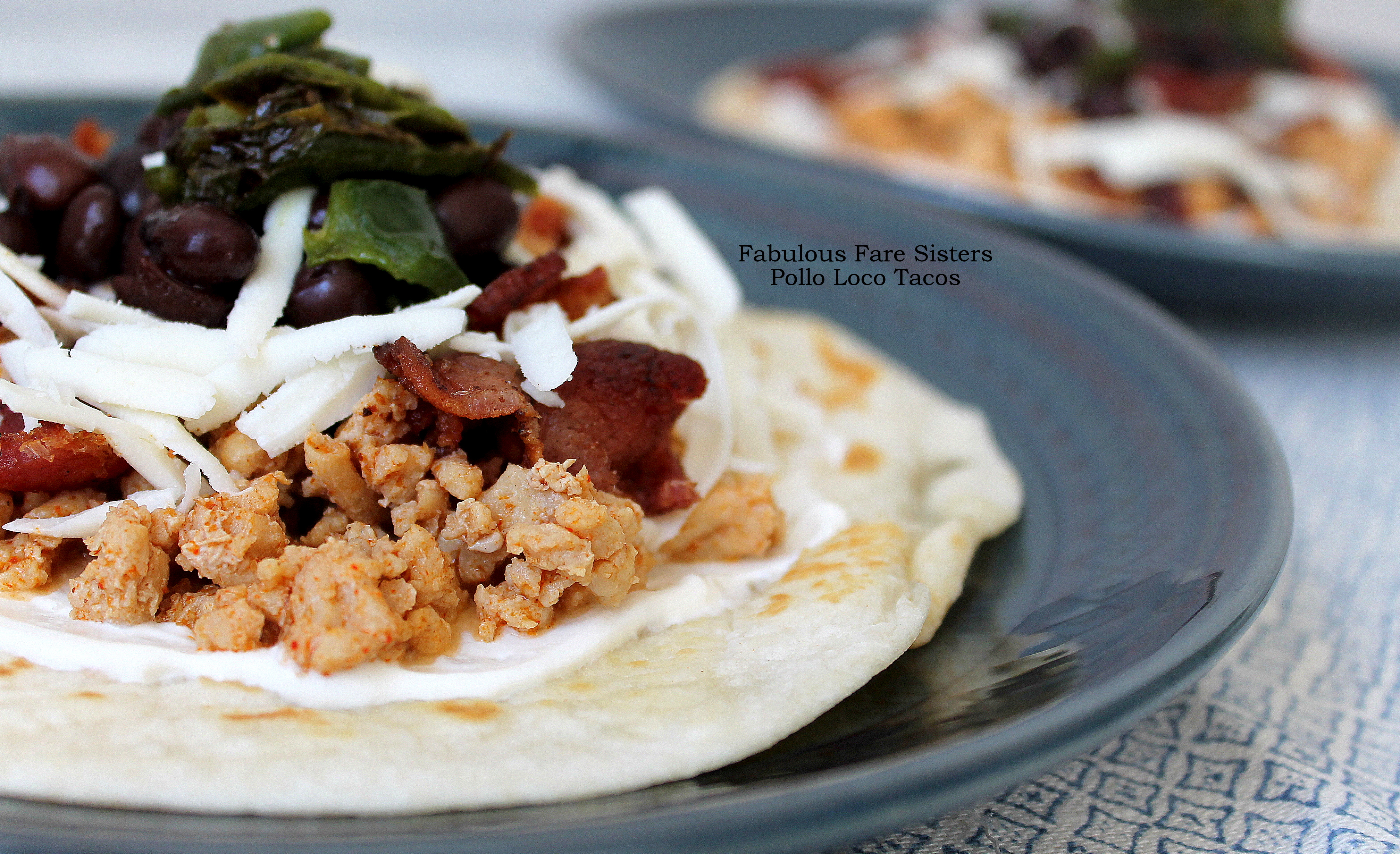 In a large skillet heat the olive oil. Add the ground chicken and the spices and cook through. Add the chicken broth, lower the heat and simmer until ready to assemble tacos. Meanwhile, cook the bacon until crisp; dice. Heat a grill pan on high heat. Place the poblano pepper on the grill grates and brown all sides until pepper is fully cooked (~ 15 minutes); remove seeds & dice. Heat the black beans and the flour tortillas. To assemble: Lay heated tortillas on plates; divide the sour cream, seasoned ground chicken, bacon, diced poblano, frijoles (black beans), and shredded queso blanco among the 8 heated tortillas. Serve warm.