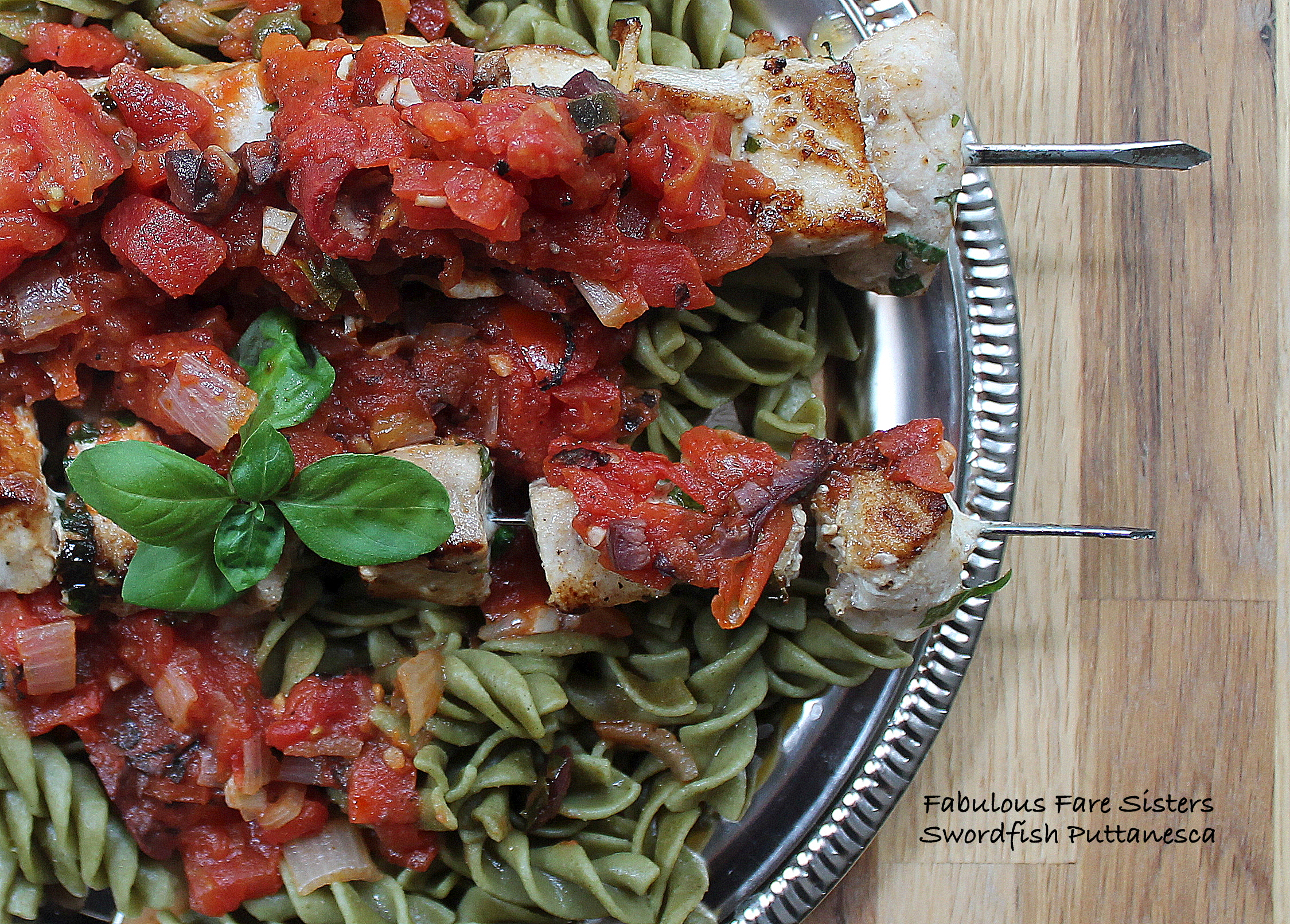 In a large skillet, sauté the garlic, shallots, ripe tomatoes, anchovy fillets, olives and capers along with one tablespoon each of fresh chopped oregano, parsley, basil, 1 teaspoon salt and fresh ground pepper for about 10 minutes. Add the fire roasted diced tomatoes and simmer a minimum of 20 minutes. Meanwhile, cut the swordfish in bite-sized cubes and marinate in some extra virgin olive oil, fresh oregano, parsley, basil, salt & fresh ground pepper. Fill 4 skewers with the marinated swordfish cubes. Heat a grill pan. Grill swordfish 1-2 minutes on each side. Serve with the pasta, if desired and Puttanesca Sauce. I served mine over Ronzoni Super Greens Rotini Pasta – a delicious pasta made with a blend of spinach, zucchini, broccoli, kale & parsley. Makes 2-4 servings.