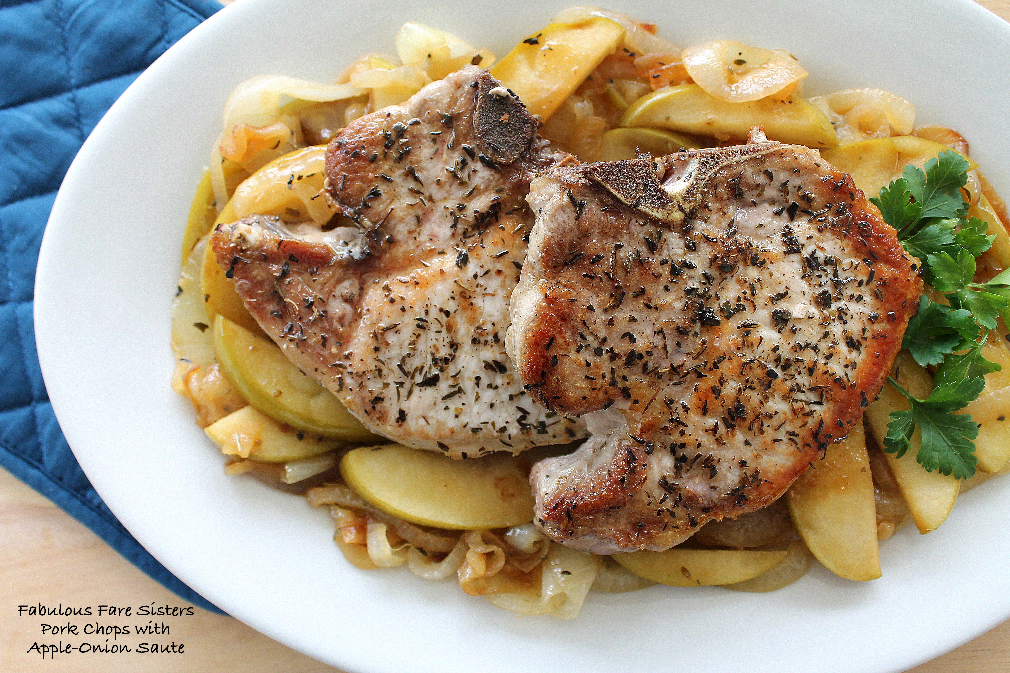 Heat oven to 400°F. In a medium sauté pan, over medium heat, sauté onions in a little hot olive oil 8-10 minutes. Add apples, 1 teaspoon Italian Herb seasoning, 1/2-1 teaspoon salt (to taste) and fresh ground pepper. Sauté ten minutes or until apples are tender. Stir in vinegar and vegetable broth. Heat through. Meanwhile, season pork chops on both sides with salt & pepper and a dash or two of Italian Herb seasoning. Heat one tablespoon of olive oil in a large oven-safe skillet. Add the pork chops and sear for 1-2 minutes on each side. Then place frying pan in the heated oven for about 5-6 minutes. To serve: Plate the Apple-Onion Sauté on a serving platter and top with pork chops. Makes 2 servings.