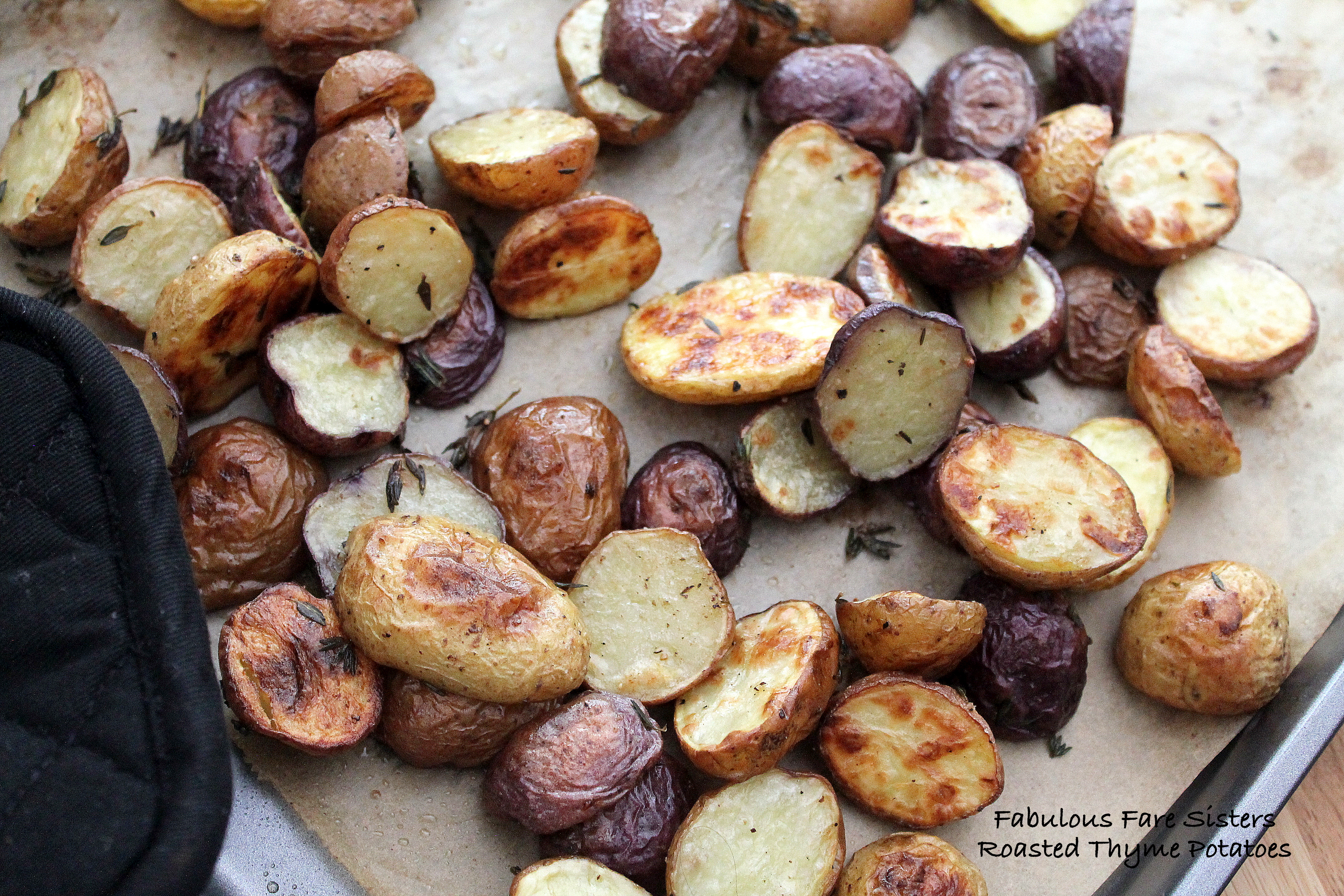 Did you know that the potato originated in southern Peru sometime between 8000-5000 BC? Wow…pretty cool. Anyway, I’m glad that they’re still around and are just as delicious now as they were back then. Mashed, boiled, roasted – Any way you make ’em. Today I’ve used baby potatoes so they cook up quicker and have a wonderful creamy flavor. The thyme adds a perfect little note to that creamy flavor…