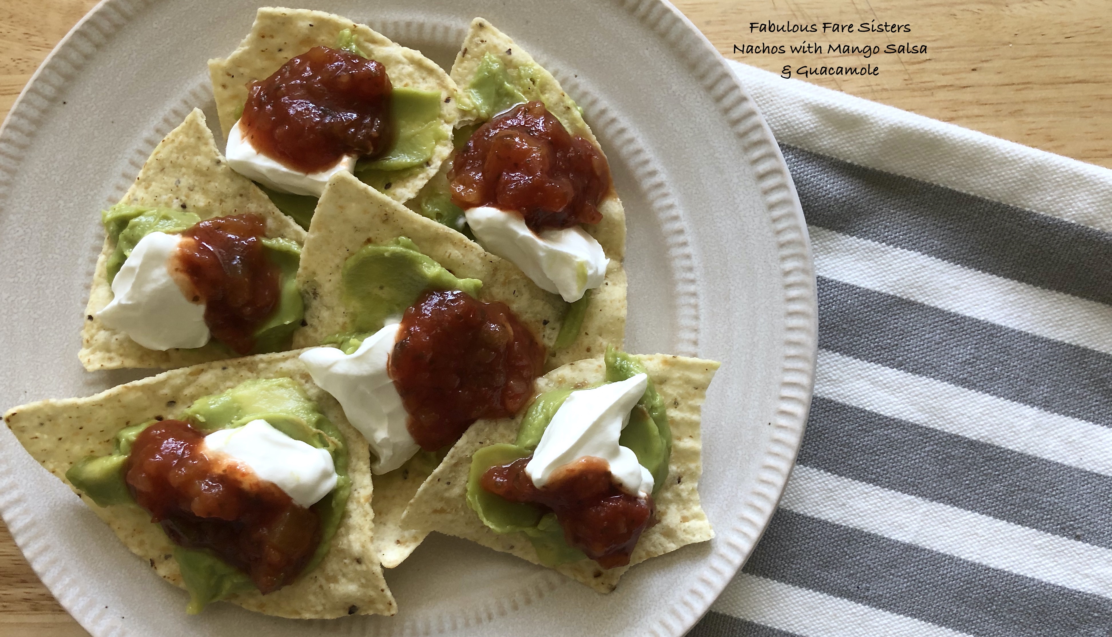 With a spoon, smooth some guacamole on each chip. Top with a spoonful each of sour cream and mango salsa. It’s as easy as that…Now take a big bite!