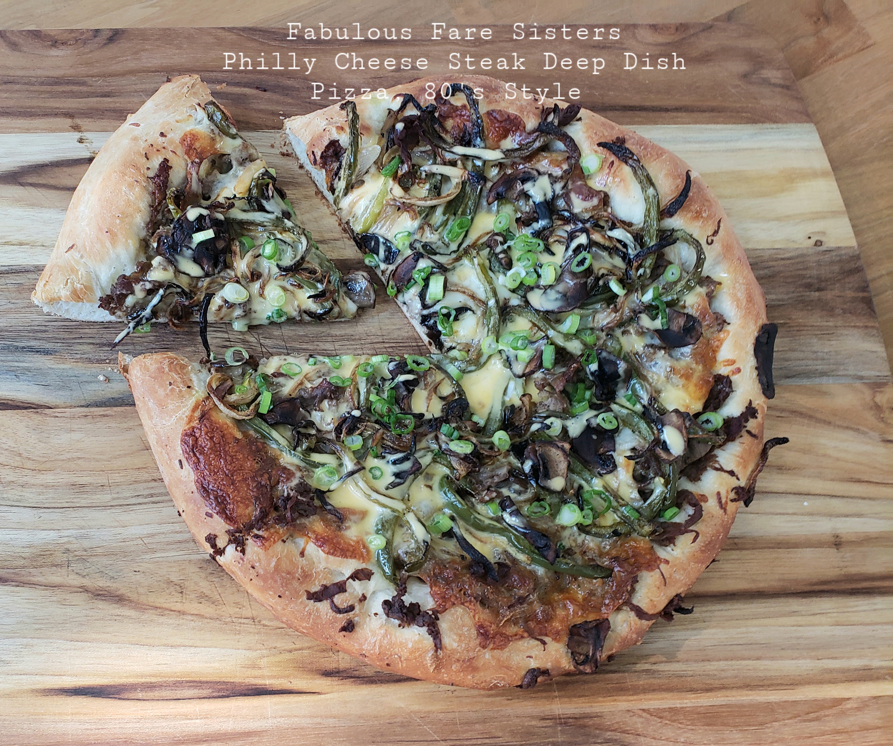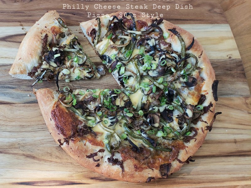 I wanted to make this cheese steak pizza because I see people making them but not the way I remember eating them when I lived in Philly in the late 80’s and early 90’s. Although controversial among cheese steak ‘purists’, this is how I loved them when I lived there. So I decided to make the pizza my way… enter… ‘Processed Cheese!’ After the pizza came out of the oven a lovely layer of melted processed cheese was poured all over this beautiful deep dish and I was transformed to 1989 all over again… Now that’s what I’m talking about!
