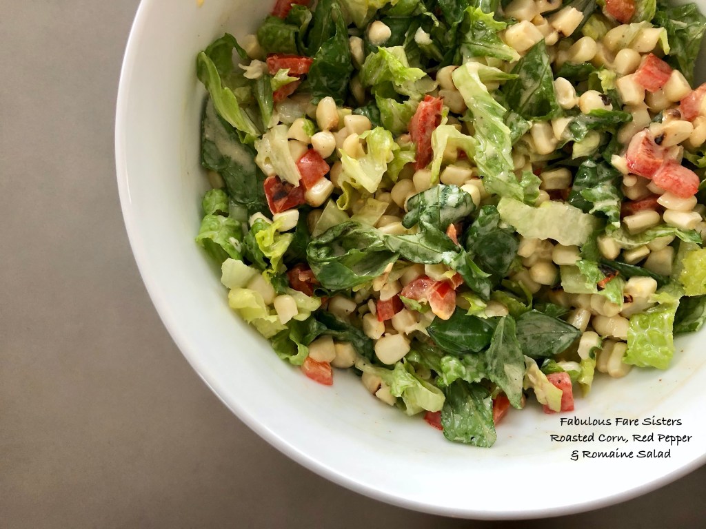 Place the corn in a pot of water, bring to a boil and cook for 2 minutes. Meanwhile combine the melted butter with about 2-3 basil leaves, chopped; add 1/2 teaspoon salt and fresh ground pepper. Heat a grill pan on high heat. Remove the corn from the water (shake the water off) and place on heated grill pan. Brush with the basil-butter & grill 6-8 minutes until slightly charred; set aside to cool. Make sure if you’re using jarred roasted red pepper to drain it very well and pat dry. Place chopped roasted red pepper in a large bowl; add the thinly sliced sweet onion. Chop the romaine lettuce into bite size pieces and add to bowl. Add the remaining whole basil leaves to bowl. Cut the corn off the cobb and add to the bowl. In a jar with a lid, combine the juice of the lime, the mayonnaise, spicy brown mustard, 1/4 cup extra virgin olive oil, 1/2 teaspoon salt & fresh ground pepper. Put the lid on and shake vigorously. Pour over contents of bowl and toss gently. Dig in!