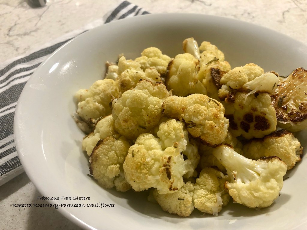 Heat oven to 425°F. Cut the cauliflower into bite-sized florets and place in a large bowl. In a jar with a lid, combine 2 tablespoons extra virgin olive oil, 1 teaspoon salt, 1/4 teaspoon fresh ground pepper and the chopped fresh rosemary. Put the lid on the jar and shake vigorously. Pour over cauliflower florets and toss well. Spread evenly onto a baking sheet and roast in heated oven for ~20 minutes until cooked and slightly browned. Remove cauliflower from oven and sprinkle with freshly grated Parmesan cheese. Serve warm.