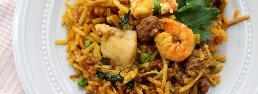 Paella is a wonderful rice dish that originated in Valencia Spain. It is a flavorful combination of ingredients cooked in a ‘Paella pan’ which is a round shallow pan with side handles. There are actually many types of Paella including Valencian, vegetarian, seafood and mixed. Today’s ‘Paella’ is a mixed, free-style version in which I used Spanish chorizo, boneless chicken thighs, large shrimp and a combination of jasmine rice and fine egg white noodles along with saffron and other spices. This is the perfect meal to cook as a couple…grab a bottle of your favorite wine…I recommend a Spanish Rioja…pour a glass and share the stove! Continue reading
